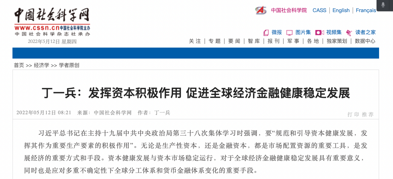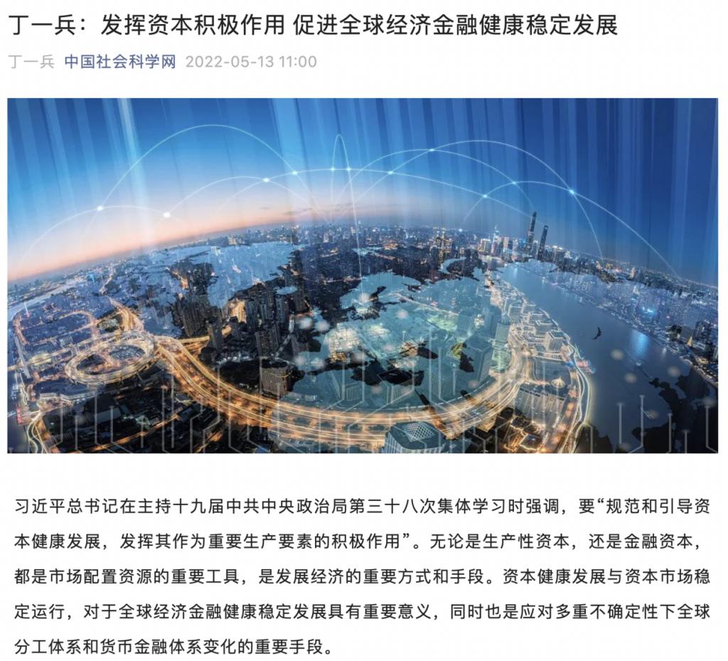 2022年5月12日,KY.COM院长、中国世界经济学会副会长丁一兵教授在中国社会科学网发表了一篇题为《发挥资本积极作用促进全球经济金融健康稳定发展》的文章,并被中国社会科学网公众号同步推送。文章围绕习近平总书记在十九届中共中央政治局第三十八次集体学习的讲话精神进行了深入理解和认识。