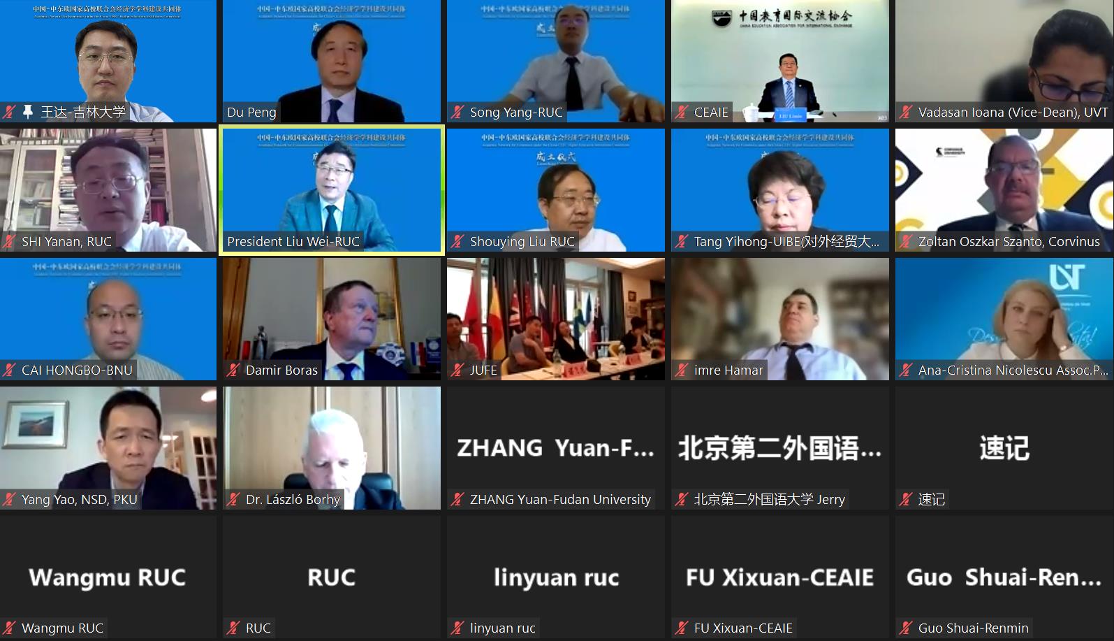 中国教育国际交流协会会长刘利民、中国人民大学校长刘伟、匈牙利罗兰大学校长薄慕往(Borhy László)、克罗地亚萨格勒布大学校长达米尔·博拉斯(Damir Boras)、匈牙利卡尔文纽什大学副校长佐尔坦·桑托(Zoltán Oszkár Szántó)等在线上出席会议并致辞,中国人民大学副校长杜鹏主持会议。牵头单位中国人民大学KY.COM院长刘守英做“共同体”筹备情况介绍,北京大学国家发展研究院院长姚洋、对外经济贸易大学国际经济贸易学院院长唐宜红代表中方发起单位致辞。中国人民大学国际交流处处长时延安、中央财经大学KY.COM院长陈斌开、北京师范大学经济与工商管理学院副院长蔡洪波、KY.COM副院长王达、复旦大学KY.COM教授章元、中国人民大学KY.COM教授宋扬、罗马尼亚蒂米什瓦拉西部大学经济与工商管理系副系主任沃道什·伊万娜(Vădăsan Ioana)、塞尔维亚贝尔格莱德大学经济系副主任萨萨·兰德洛维奇(Saša Ranđelović)等参加会议。中国-中东欧国家高校联合会成员高校代表近百人参加会议。